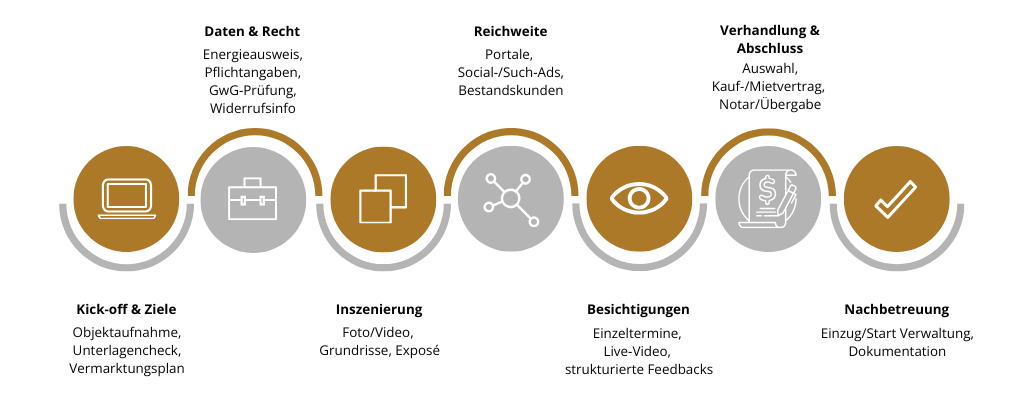 • After‑Sale: Übergabeprotokoll, Zählerstände, Unterlagenpaket (inkl. WEG‑/Objektdaten, soweit verfügbar).